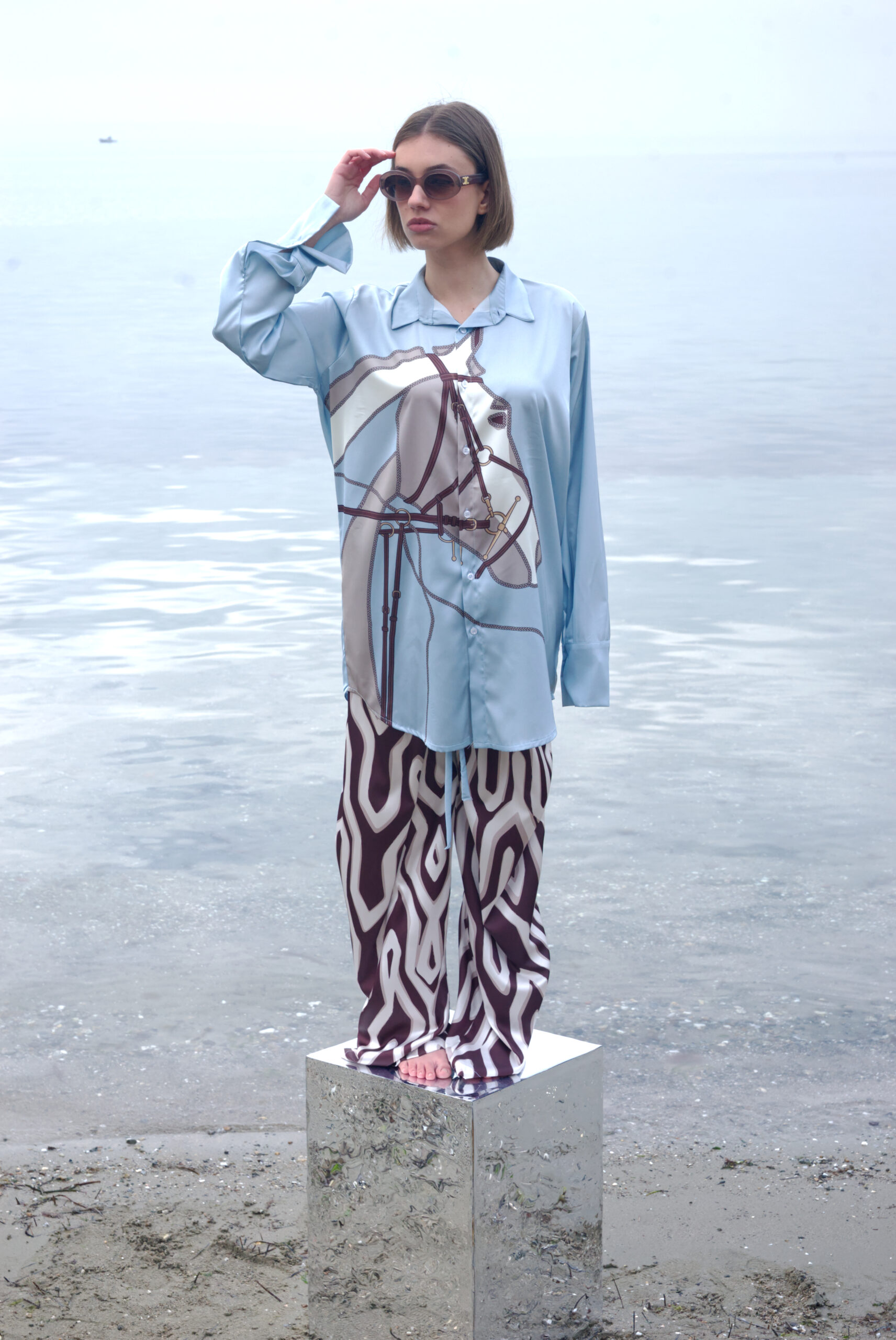 Παντελόνα σατέν print με γεωμετρικά σχέδια brown&light blue .