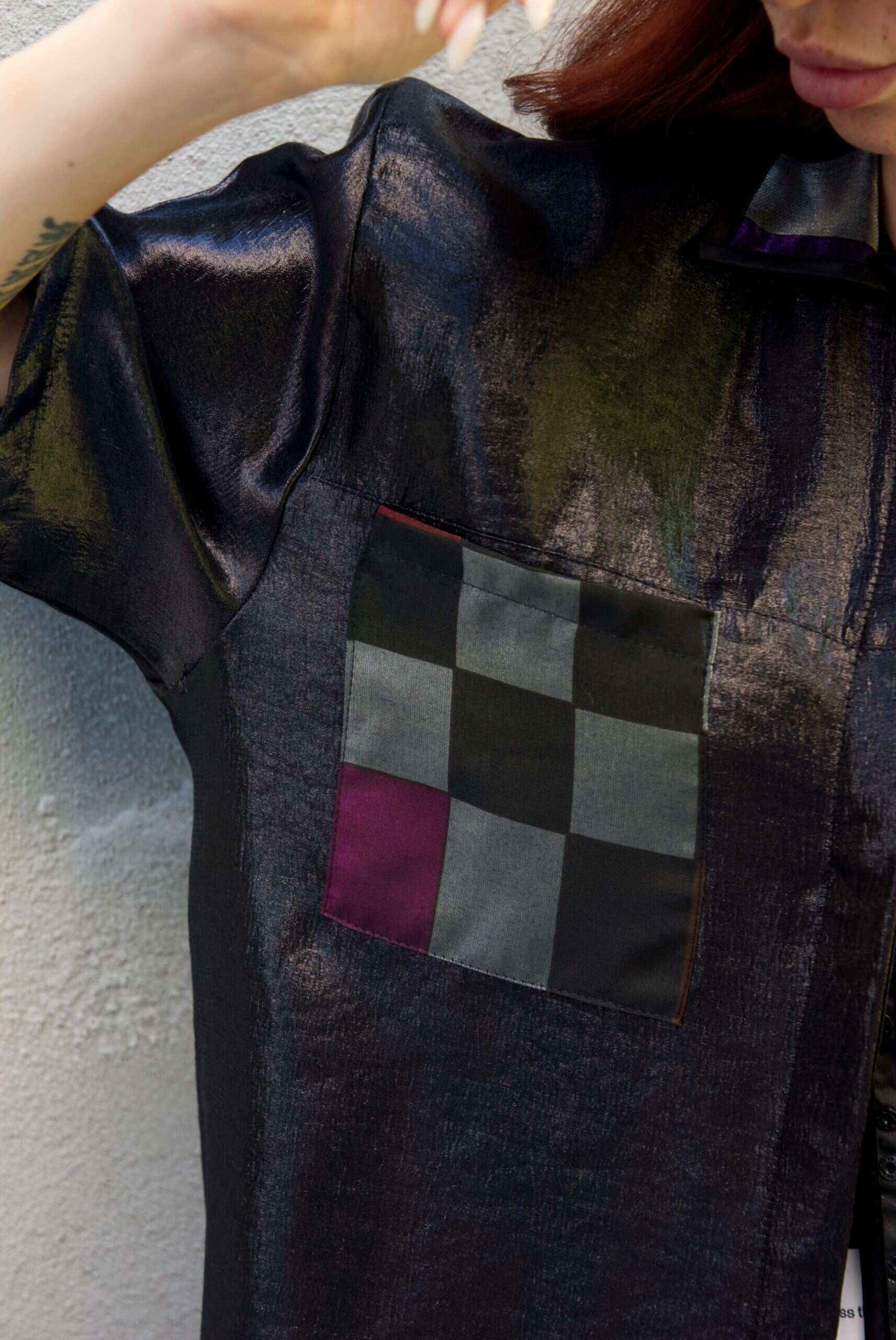 Πουκαμίσα κοντομάνικη σε loose γραμμή one size . Έχει μπροστά κούμπωμα με κλιπ σε στυλ σούστα . Φινίρισμα από σατέν μαύρο ρέλι